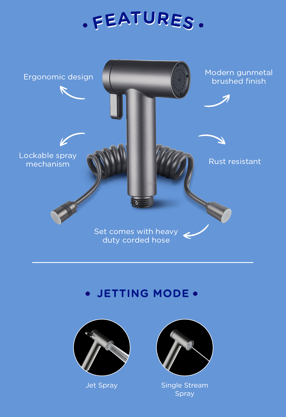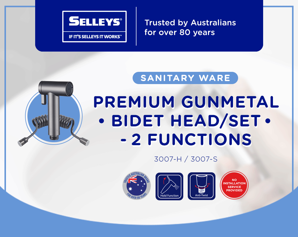 Selleys Premium Gunmetal Bidet Head/Set – 2 Functions has an ergonomic design with a lockable spray mechanism. The bidet head has 2 types of spray modes and can improve water pressure.